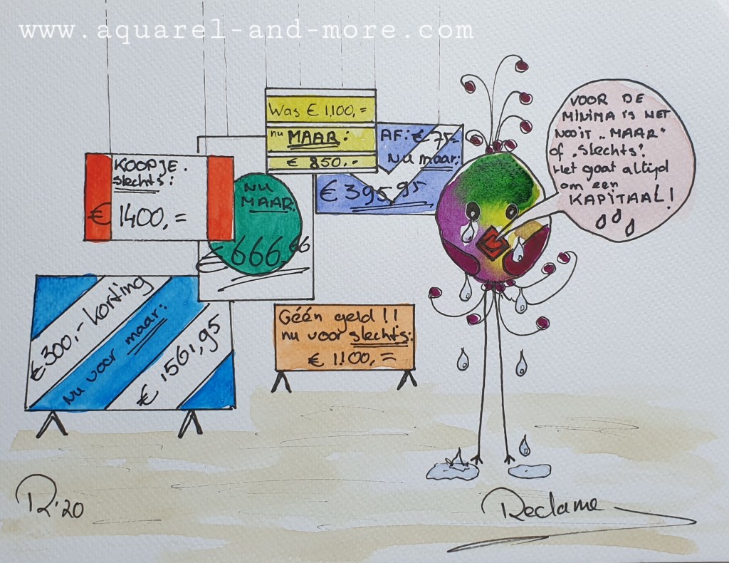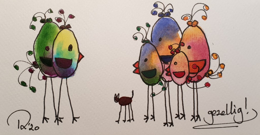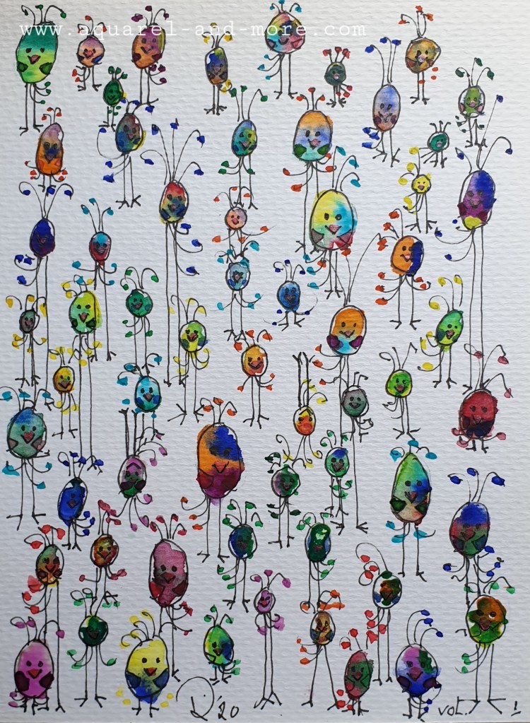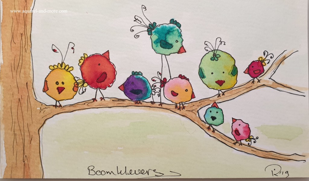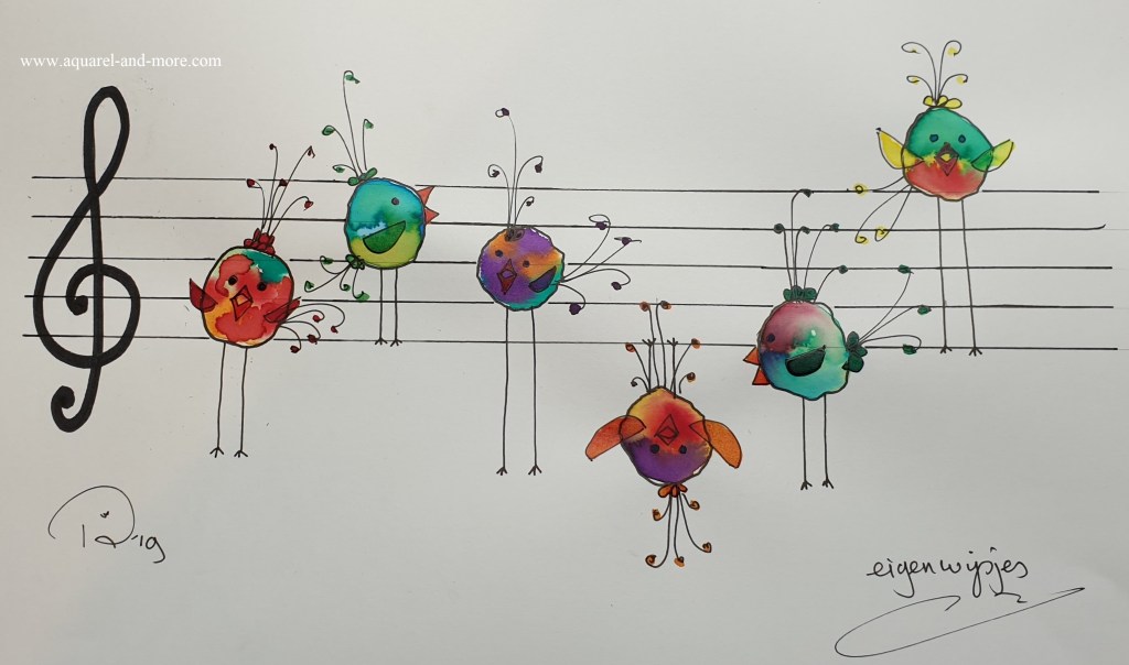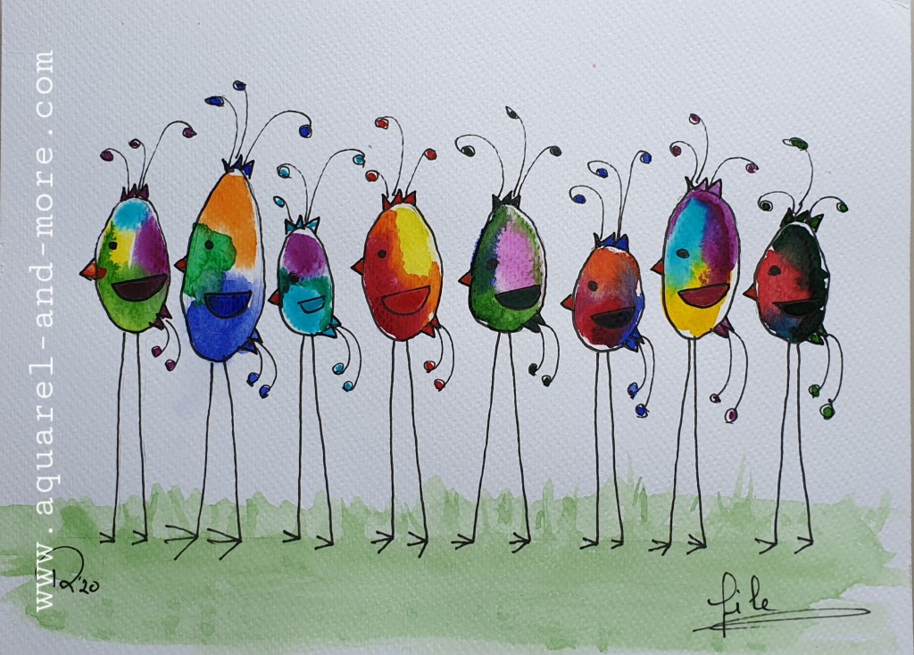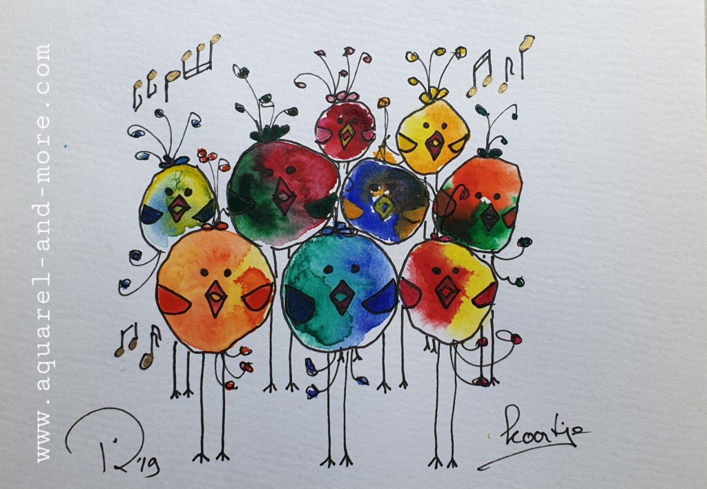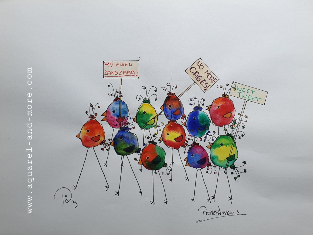Singing their own song….., Ingelijst 40 x 50 cm € 145.– Under mother’s wings Ingelijst 30 x 40 cm € 125.– Ingelijst 30 x 40 cm € 125.–Let’s splash , Ingelijst 30 x 40 cm € 125.– tree clovers ingelijst 24 x 30 € 100.– Birds 3, Ingelijst 30 x 40 cm- € 125.–Sheltering under Mam’s umbrella…., Ingelijst 30 x 40 cm € 125.–fishing for compliments… 24 x 18, aquarelverf en pen € 30.–fishing for compliments 2 … 24 x 18, aquarelverf en pen € 30.– 120 DB + concert 24 x 18, aquarelverf en pen € 30.– baking……24 x 18, aquarelverf en pen € 30.– Cranes 24 x 18, aquarelverf en pen € 30.–Oh…..i’m SO beatifull ….24 x 18, aquarelverf en pen € 30.–Beaty therapist. Sold FIrst day at school 24 x 18, aquarelverf en pen € 30.–Knupje serie, 24 x 18, ecoline, aquarelverf en pen € 30.–Free bird , 19 x 14,5 aquarelverf en pen € 25.–Under mothers wings. Sold Let’s dance 2……24 x 18, aquarelverf en pen € 30.–The Nightwatch(man), 30 x 18, aquarelverf, parelmoerverf, tekeninkt en pen op zwart papier. € 40.– traffic jam 24 x 18, aquarelverf en pen € 30.–Protest march, 36 x 27 cm aquarelverf en pen € 40.–On we go….. , 24 x30, ecoline, aquarelverf en pen 40.–Summer time…..30 x 21, aquarelverf, inkt en pen € 40.–24 x 18, aquarelverf en pen € 30.–24 x 18, aquarelverf en pen € 30.–24 x 18, aquarelverf en pen € 30.–24 x 18, aquarelverf en pen € 30.–24 x 18, aquarelverf en pen € 30.–The carnaval is over….., 20 x 30, aquarelverf, pen en stift. € 40.–24 x 18, aquarelverf en pen € 30.–24 x 18, aquarelverf en pen € 30.–Let’s dance …. 24 x 18, aquarelverf en pen € 30.– Dutch supporter 24 x 18, aquarelverf en pen € 30.– Dutch supporter 2 24 x 18, aquarelverf en pen € 30.–Carnival, 20 x 30, aquarelverf, pen en stift. € 50.–