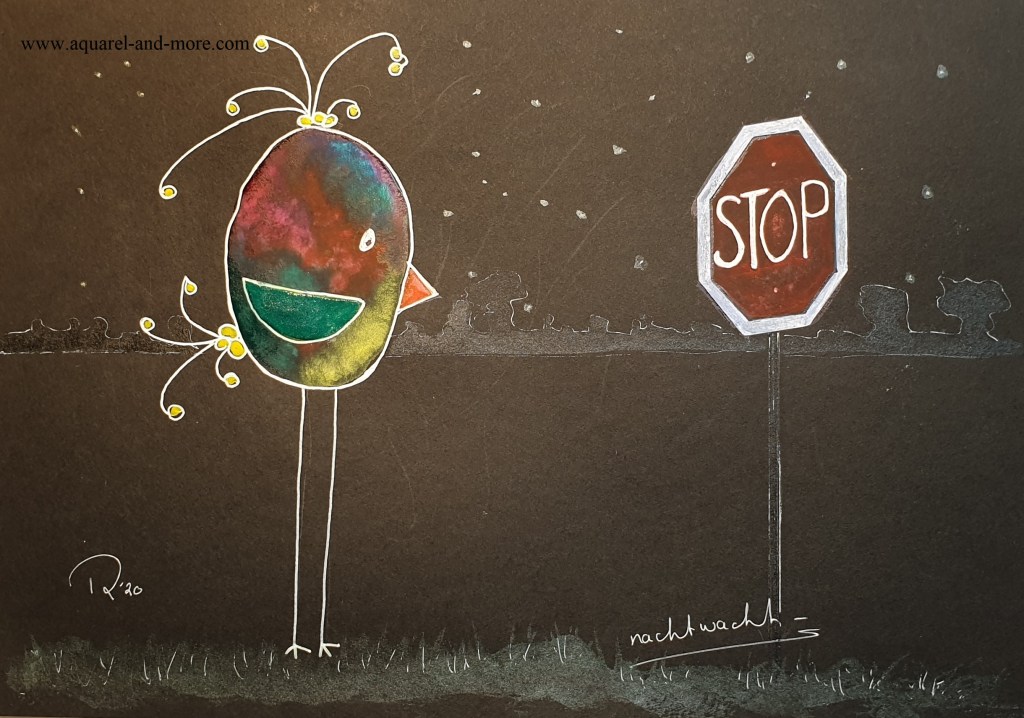 Early birds , 20 x 30, aquarelverf. parelmoerverf en tekenpen op zwart papier € 40.–