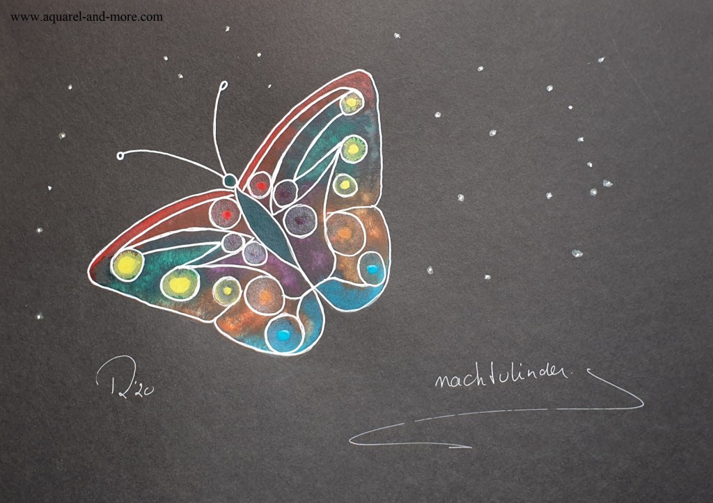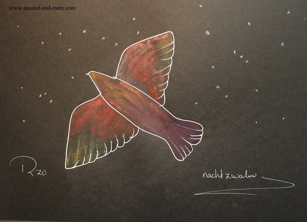 Moth, 20 x 30, aquarelverf. parelmoerverf en tekenpen op zwart papier € 30.–Butterfly 18 x 22, aquareverf, parelmoerverf en pen € 30.–Nightjar, 20 x 30, aquarelverf. parelmoerverf en tekenpen op zwart papier € 30.–Nacht owl, 20 x 30, aquarelverf. parelmoerverf en tekenpen op zwart papier € 30.– 18 x 24, aquarelverf, pen en tekeninkt € 30.–Autumn, aquarelverf en pen, 30 x 21 cm, € 40.–30 x 24, ecoline, aquarelverf en pen € 30.–High tea invitation , 19 x 14.5, aquarelverf en pen. floral rainbow 36 x 26, aqurelverf, potlood en pen € 30.–