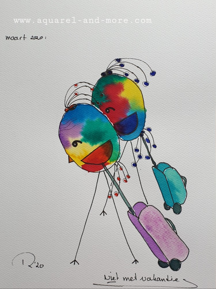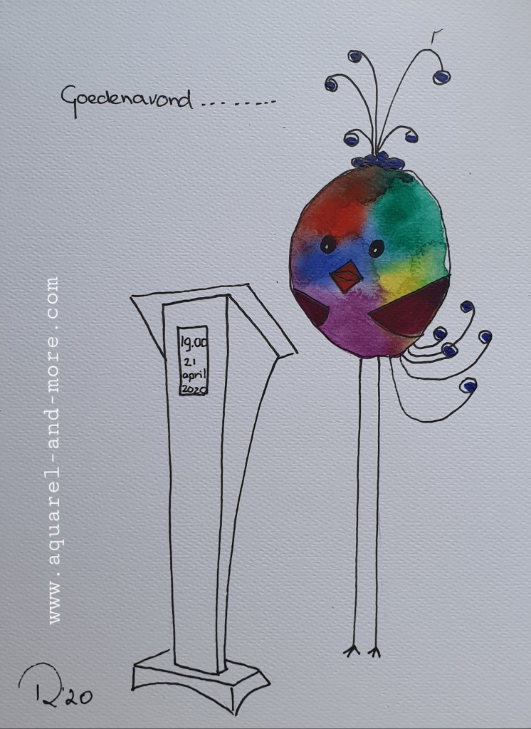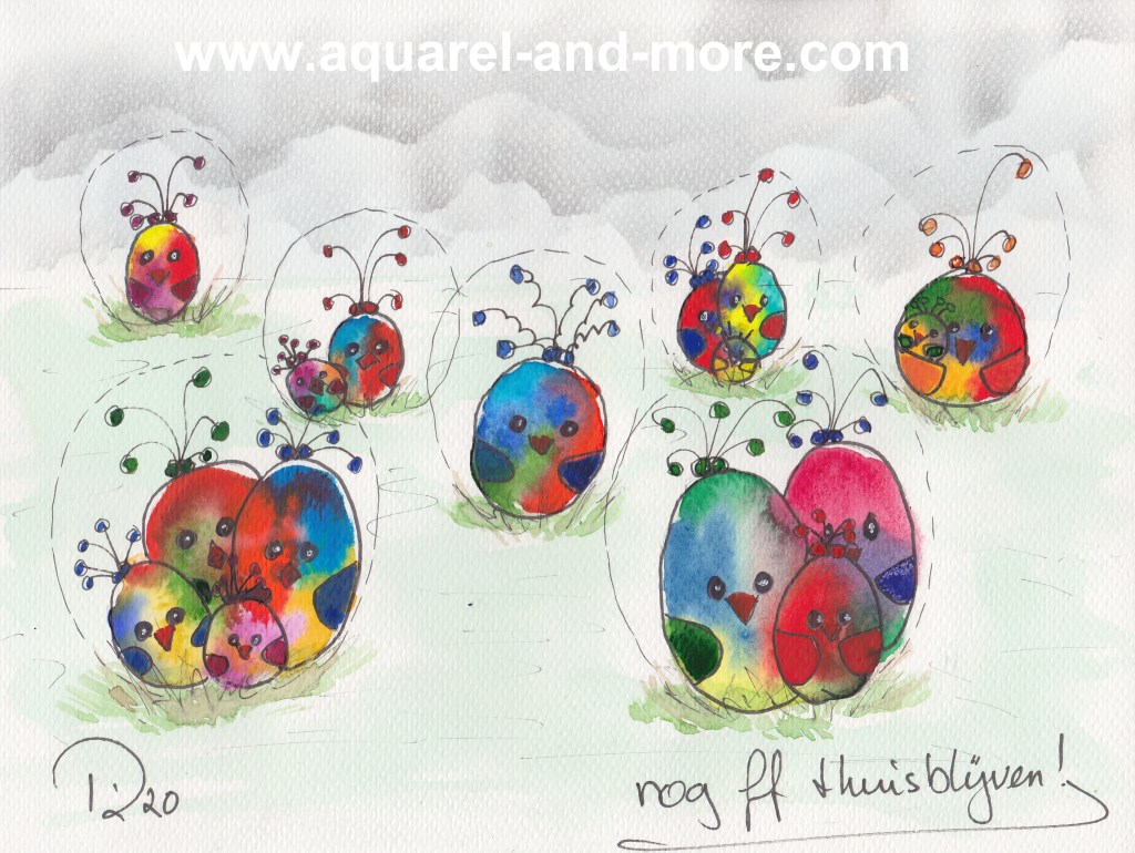 Still in lockdown…. 24 x 18, aquarelverf en pen € 30.–Christmas bubble, 24 x 18, aquarelverf en pen € 30.– Coupe Corona 24 x 18, aquarelverf en pen € 30.–the new world…24 x 18, aquarelverf en pen € 30.–substantiation..24 x 18, aquarelverf en pen € 30.– isolation at home ..24 x 18, aquarelverf en pen € 30.–press conference..24 x 18, aquarelverf en pen € 30.–24 x 18, aquarelverf en pen € 30.– mogen we alweer douchen of is het nog steeds ‘handen wassen’?love behind glas..24 x 18, aquarelverf en pen-Liefde achter glas € 30.–Just wanted to see you..24 x 18, aquarelverf en pen Ik wou je even zien…… € 30.– No vacation this year 24 x 18, aquarelverf en pen € 30.–hospitalheros in white 24 x 18, aquarelverf en pen € 30.–Vergeetmenietje, symbool van Stichting Alzheimer Nederland. 24 x 18, aquarelverf en pen € 30.–A drink with the neighbours…. 24 x 18, aquarelverf en pen € 30.–Balkoningsdag24 x 18, aquarelverf en pen € 40.–birthday visitors on 1 1/2 meters24 x 18, aquarelverf en pen € 30.–Full / Vol op anderhalve meter24 x 18, aquarelverf en pen € 30.–Stay at home when you have a cold…Als je verkouden bent blijf je thuis! 24 x 18, aquarelverf en pen € 40.–Niet zeuren maar kleuren………… Woningsdag24 x 18, aquarelverf en pen € 30.–Woningsdag 24 x 18, aquarelverf en pen € 40.–Woningsdag 224 x 18, aquarelverf en pen € 40.–Vergeetmenietje, symbool van Stichting Alzheimer Nederland 24 x 18, aquarelverf en pen € 30.–Vergeetmenietje, symbool van Stichting Alzheimer Nederland 24 x 18, aquarelverf en pen € 30.–